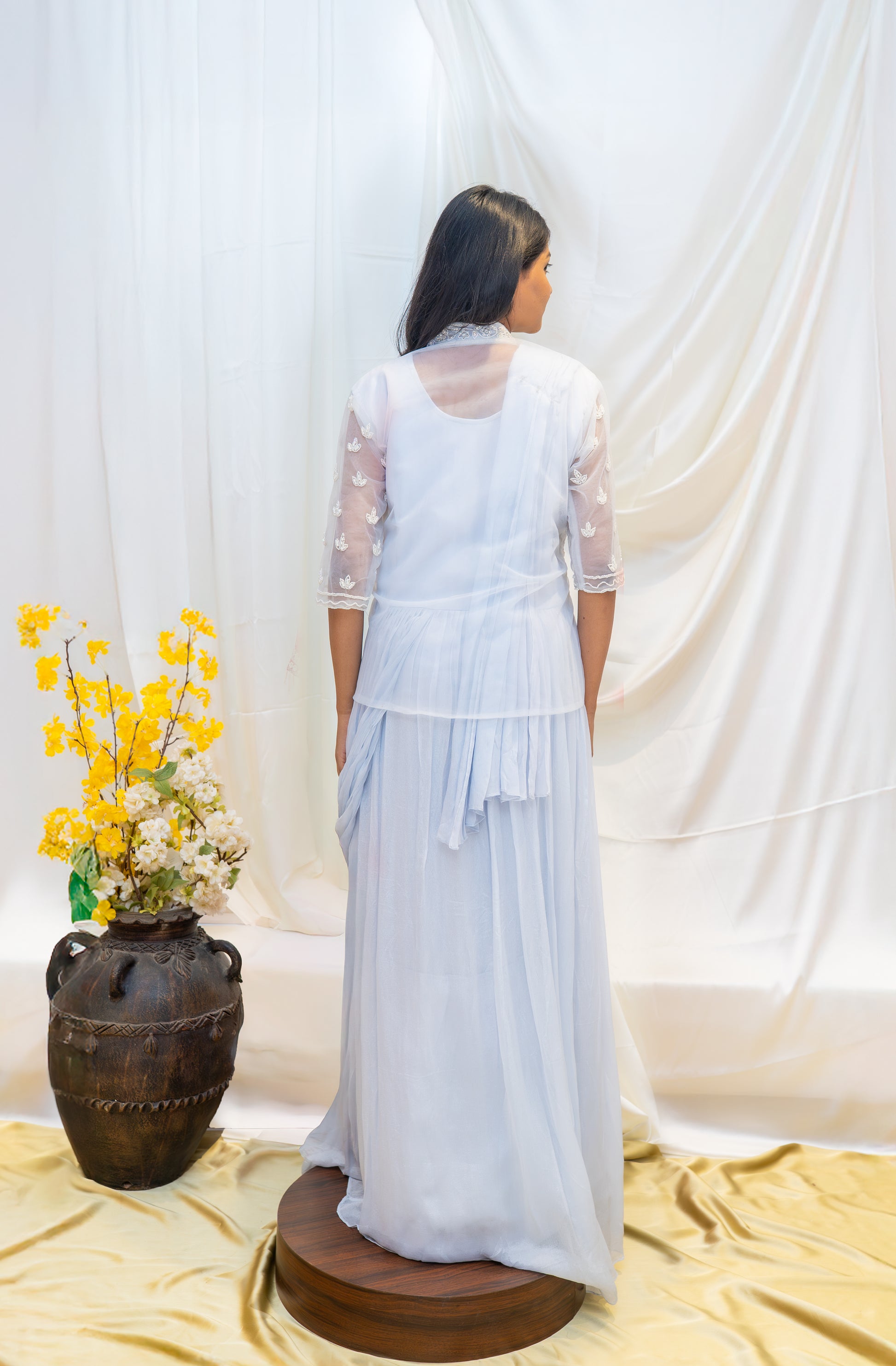 An elegant pastel blue draped gown paired with a delicately embroidered sheer jacket.