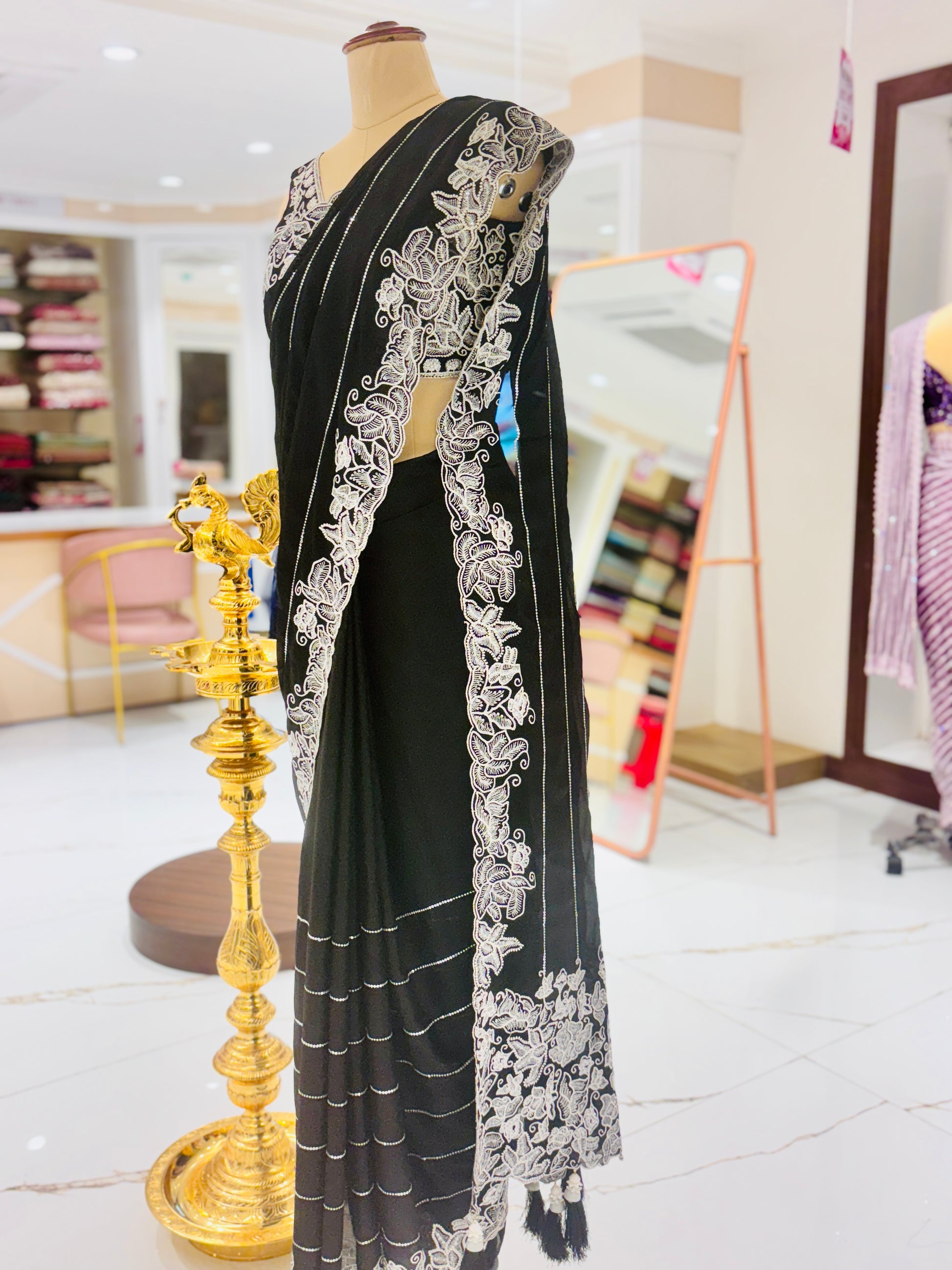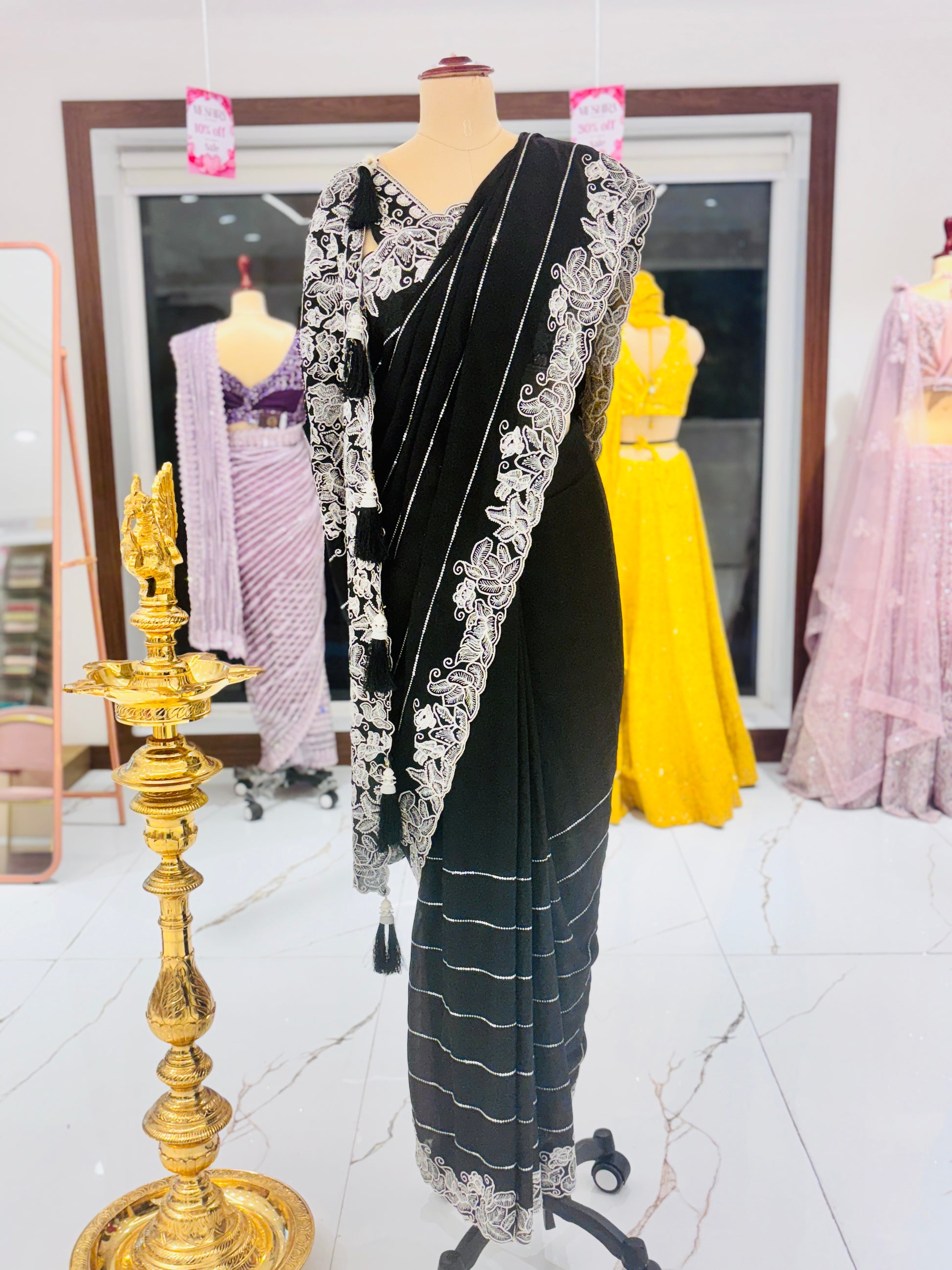 Black Georgette Ready-to-Wear Saree with Ivory Embroidery