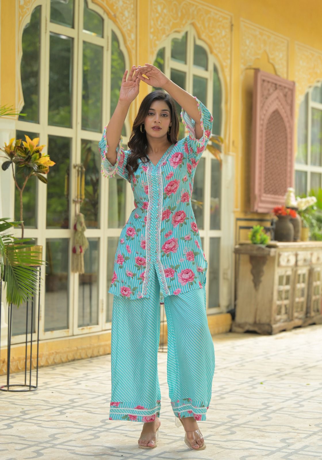 A turquoise kurta with pink floral prints and striped pants, featuring decorative details and pom-pom trimmed sleeves for a chic ethnic look