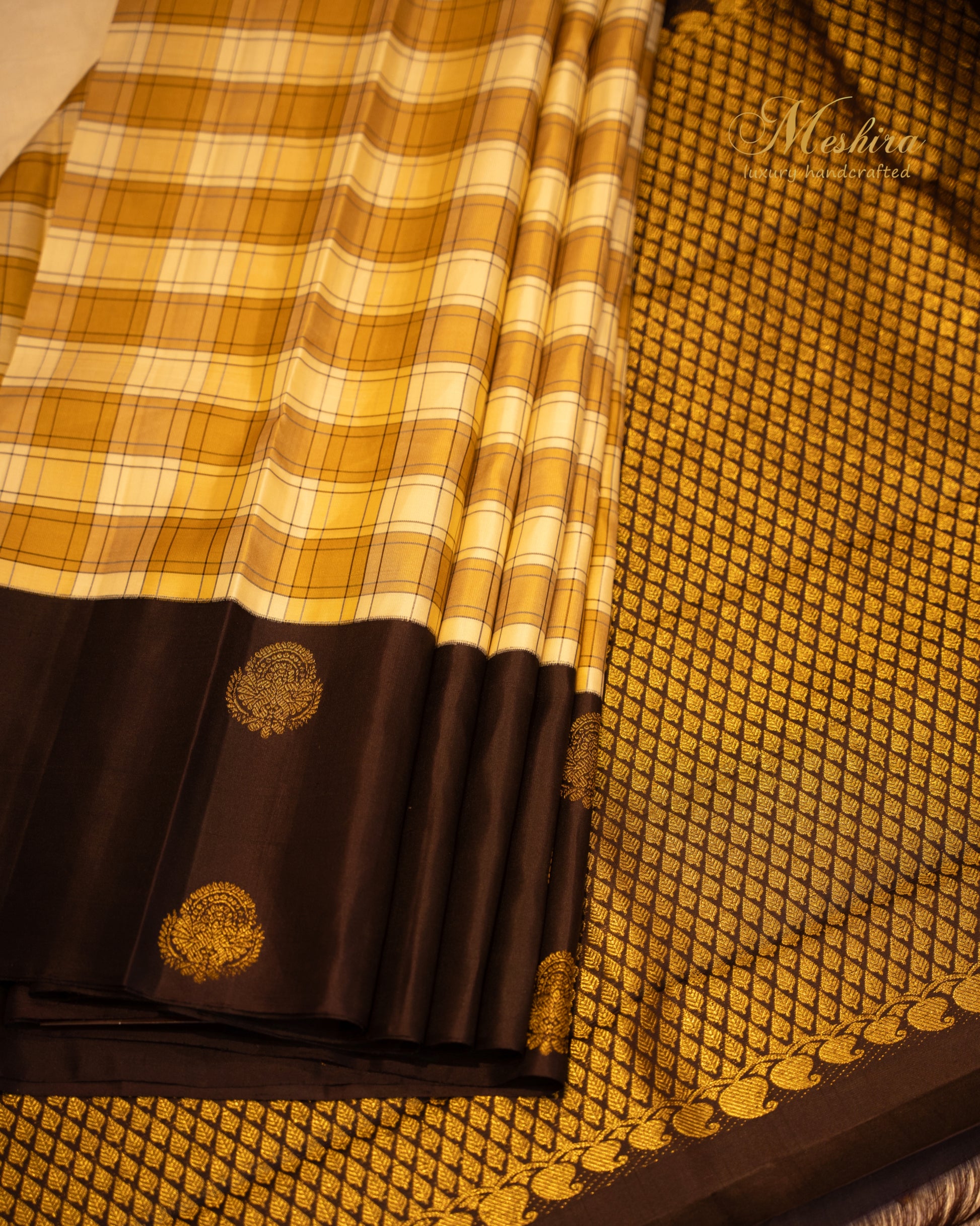 Mustard and ivory checked body, contrasted beautifully by a deep coffee brown border and pallu. Adorned with subtle golden zari buttas along the pleats and a richly woven paisley pallu.
