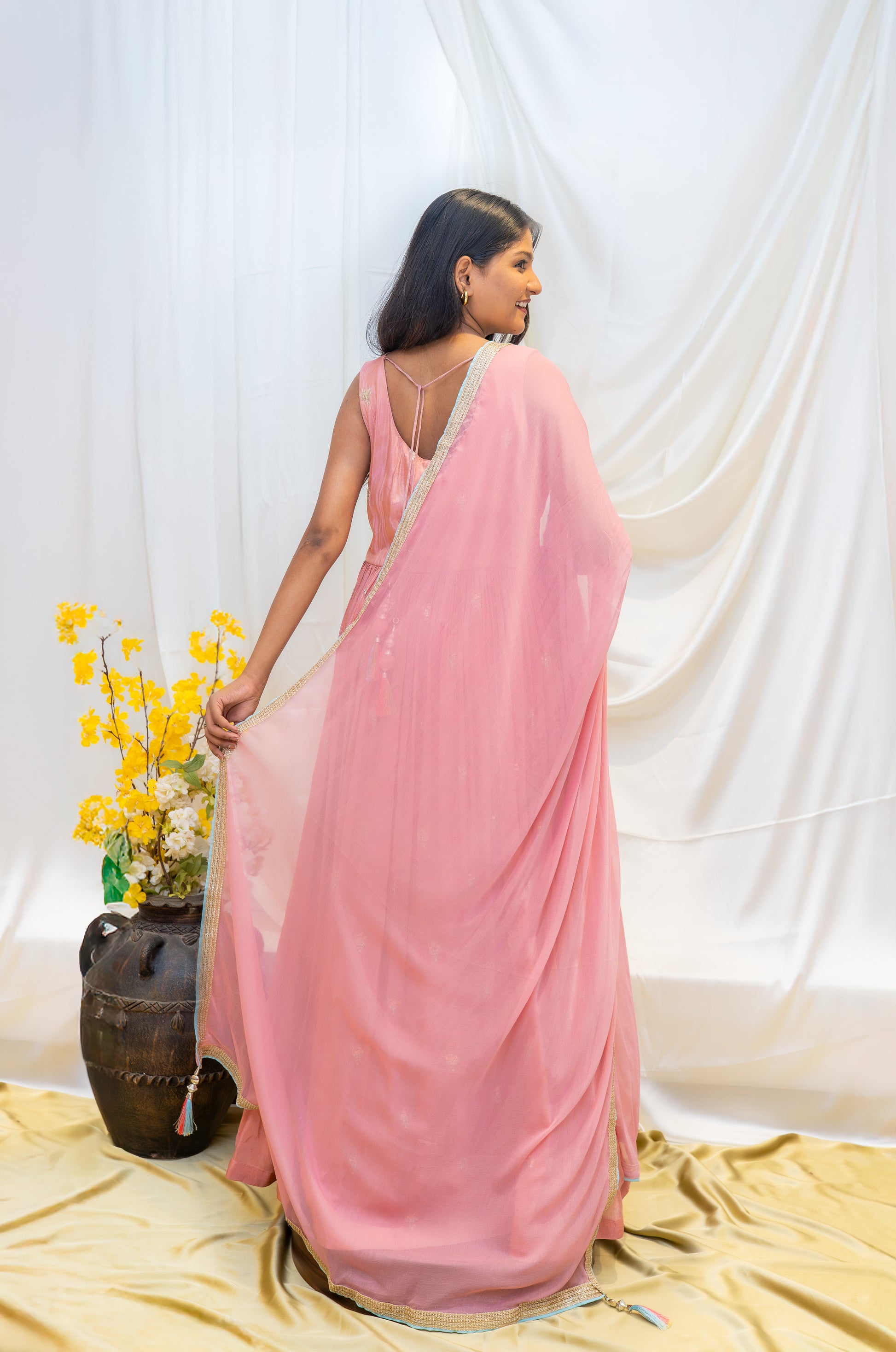 Soft pink traditional gown with gold embroidery, paired with a matching pink shawl.