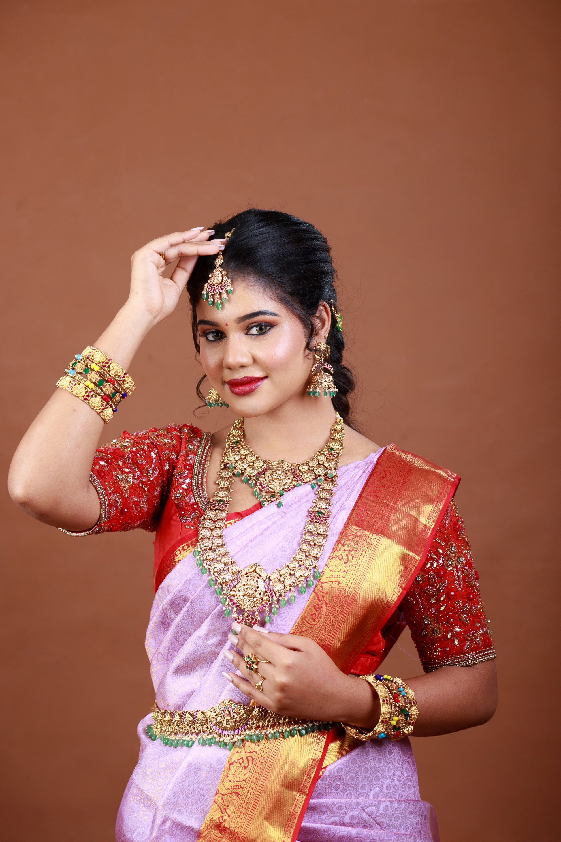 A graceful lavender silk saree with rich red and gold borders, paired with a beautifully embroidered red blouse for a royal traditional look